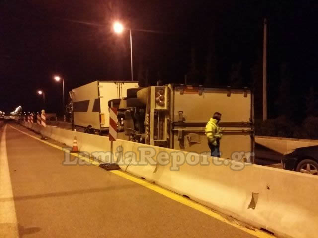 Ο οδηγός συρόμενης νταλίκας, που μετέφερε πέλετ, έχασε τον έλεγχο και ακολουθώντας μια τρελή πορεία το βαρύ όχημα βρέθηκε με τουμπαρισμένο το πίσω μέρος του.