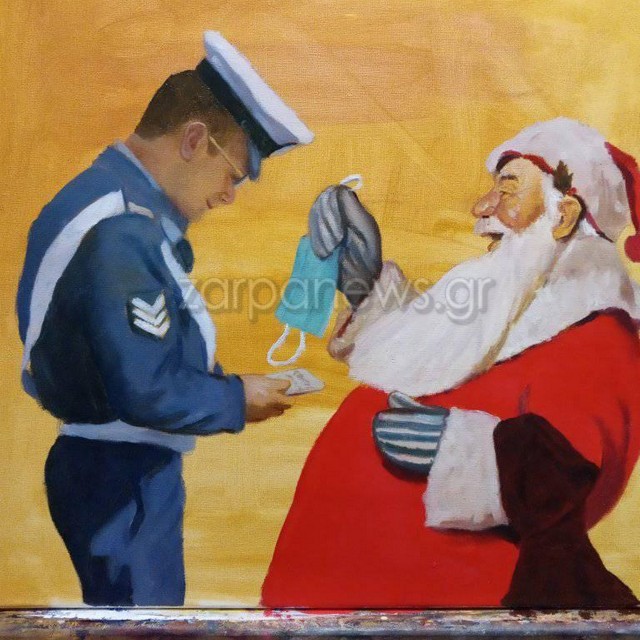 Τα μέτρα για τον κορονοϊό “έπιασαν” και τον Άι-Βασίλη, με τον αστυνομικό να έχει ήδη εντοπίσει τον παραβάτη. Δεν πρόκειται για πραγματικό γεγονός, αλλά για μια ελαιογραφία, της οποίας ο δημιουργός είναι ένας αστυνομικός στην Κρήτη.