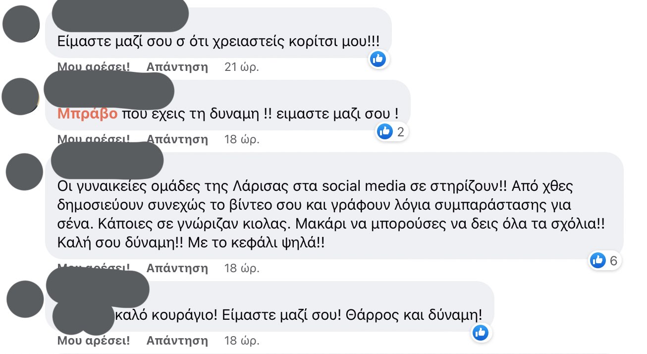 Μια νέα γυναίκα και μητέρα στη Λάρισα που έζησε τον απόλυτο εφιάλτη στα χέρια του συζύγου της. Όπως τονίζει η κακοποίηση ήταν συστηματική και η ζωή της, μια κόλαση κοντά του. Πλέον αισθάνεται ελεύθερη και ανακουφισμένη. Έχει φύγει από το σπίτι που ζούσε με εκείνον και έχει κινήσει τις διαδικασίες για να απαλλαγεί οριστικά. Κάτοικοι της πόλης που είδαν το βίντεο και έμαθαν για την ιστορία, σπεύδουν με αναρτήσεις να της δώσουν κουράγιο.
