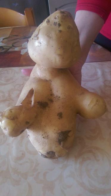 Πατάτα όμως σε αυτό το σχήμα και σχεδόν ενός κιλού, σπάνια βρίσκουν. Η πατάτα αυτή έχει ύψος 35 πόντους και ζυγίζει ένα κιλό και ο παραγωγός που την έβγαλε από το χωράφι του στη Λακκόπετρα, όπως υποστηρίζει τη βλέπει να έχει το σχήμα… μωρού!