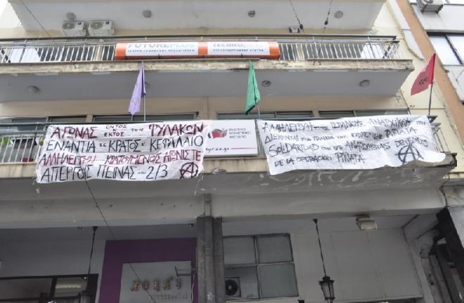 Οι διαδηλωτές έχουν αναρτήσει πανό τόσο στο μπαλκόνι των γραφείων όσο και στην κεντρική είσοδο του πεζοδρομίου στο οποίο και αναφέρουν το αίτημά τους για κατάργηση των φυλακών τύπου Γ΄ αλλά και την αλληλεγγύη τους στους απεργούς πείνας, μέλη της Συνωμοσίας Πυρήνων της Φωτιάς: Μαυρόπουλος Θεόφιλος, Νικολόπουλος Γεώργιος, Νικολόπουλος Μιχάλης, Αργυρού Παναγιώτης, Μπολάνο Δαμιανός, Χατζημιχελάκης Χαρίλαος, Τσάκαλος Χρήστος, Πολύδωρας Γεώργιος, Τσάκαλος Γεράσιμος και Οικονομίδου Όλγα