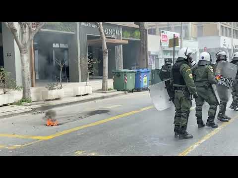 Οι δυνάμεις των ΜΑΤ απώθησαν τα άτομα προς το κέντρο της Θεσσαλονίκης, όπου συνεχίστηκαν τα επεισόδια. Στην οδό Μοναστηρίου, κάδοι έχουν πάρει φωτιά.