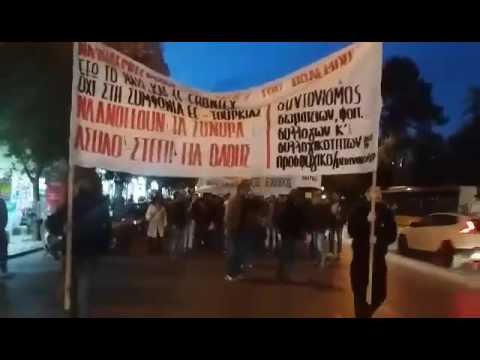 Οι διαδηλωτές εξέφρασαν την αλληλεγγύη τους στους πρόσφυγες. Συγκεντρώθηκαν στο άγαλμα του Βενιζέλου έκαναν πορεία κρατώντας πανό που έγραφε μεταξύ άλλων “Να πολεμήσουμε τις αιτίες του πολέμου. Έξω το ΝΑΤΟ και η FRONTEX. Να ανοίξουν τα σύνορα. Άσυλο- στέγη για όλους”. H πορεία κατέληξε στο άγαλμα του Βενιζέλου.