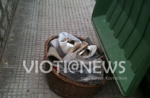 Δίπλα σε κάδους σκουπιδιών όπως βλέπετε και στην φωτογραφία του voiotianews.gr, εκεί που πολλοί άποροι αναζητούν κάτι για να φάνε, υπάρχουν σακούλες με παπούτσια.