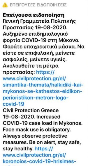 «Γενική Γραμματεία Πολιτικής Προστασίας 12-08-2020. Αυξημένο επιδημιολογικό φορτίο COVID-19 στη Μύκονο. Φοράτε υποχρεωτικά μάσκα. Να είστε σε επιφυλακή, μείνετε υγιείς. Ακολουθείτε τα μέτρα προστασίας».