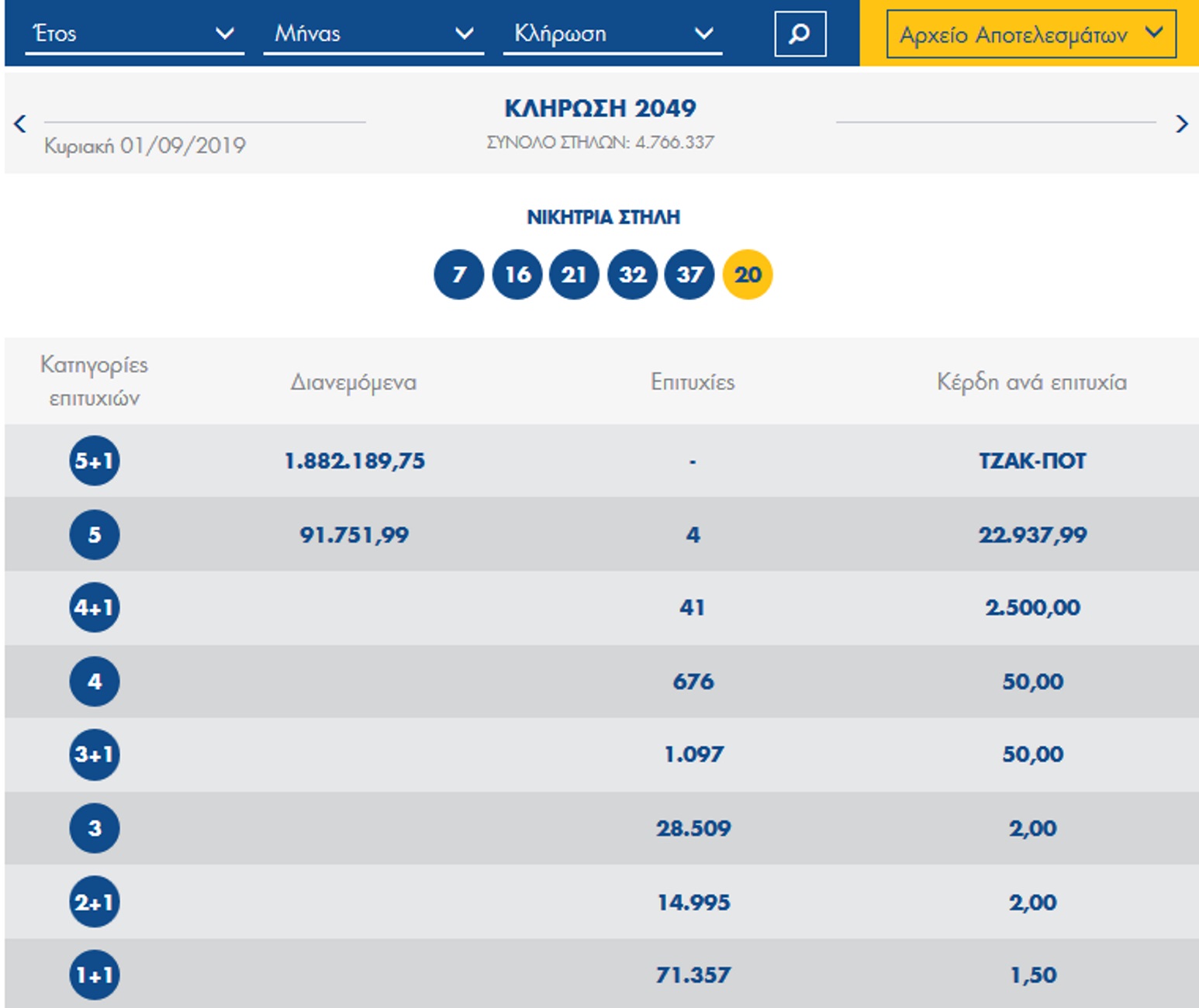 Τα δελτία κόστιζαν από 1,5 έως 5,5 ευρώ και δεν ήταν τυχαίας επιλογής. Για την ιστορία στην κλήρωση Τζόκερ ΟΠΑΠ, χθες Κυριακή 01-09-2019 (αριθμός κλήρωσης 2049), οι τυχεροί αριθμοί είναι: 7, 37, 32, 16, 21 και τζόκερ ο αριθμός 20.