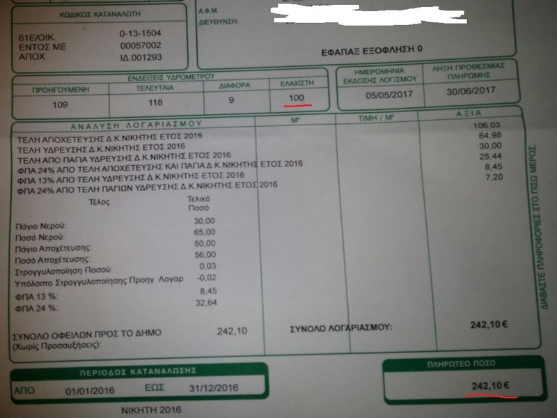 Με απόφαση του δήμου Σιθωνίας, ανέβηκε η ελάχιστη κατανάλωση νερού σε όλους τους μόνιμους και μη κατοίκους. Ιδιοκτήτης ακινήτου στην Νικήτη της Χαλκιδικής, καταγγέλλει μια απόφαση του δήμου, που τους υποχρεώνει να πληρώνουν υψηλούς λογαριασμούς νερού και ας μην μένουν στα εξοχικά τους! «Διατηρώ εξοχικό στη Νικήτη Χαλκιδικής. Σήμερα μου ήρθε με το ταχυδρομείο ο λογαριασμός ύδρευσης για το εν λόγω σπίτι. Ενώ κάθε χρόνο κυμαινόταν γύρω στα 90€ (ετήσιος), φέτος ανήλθε στα 245€! Πιστεύοντας ότι επρόκειτο για κάποιο λάθος στη μέτρηση, επικοινώνησα με τον δήμο όπου με ενημέρωσαν ότι δεν επρόκειτο για λάθος, αλλά πως μετά από απόφαση του δήμου, αποφασίστηκε πως σε όλα τα σπίτια θα χρεώνεται υποχρεωτικά ελάχιστη κατανάλωση 100 κυβικών μέτρων κατανάλωσης!» αναφέρει ο ιδιοκτήτης.