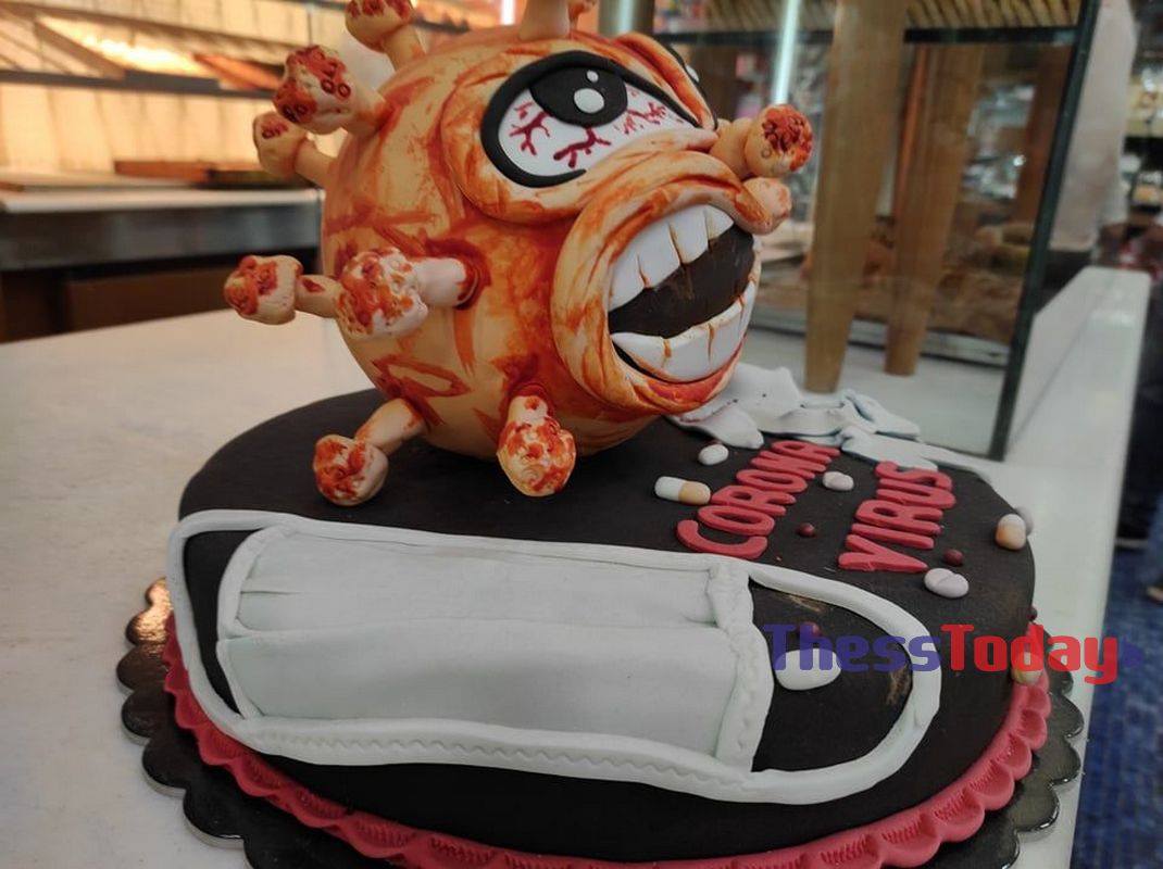 Αυτή η εκδοχή του κορονοϊού μόνο τρομακτική δεν θα μπορούσε να χαρακτηριστεί… Ζαχαροπλάστης στη Θεσσαλονίκη εμπνεύστηκε από την πανδημία και δημιούργησε μία 3D τούρτα που απεικονίζει το στέλεχος του ιού, πλαισιωμένη από τη μάσκα προστασίας και τα χειρουργικά γάντια.